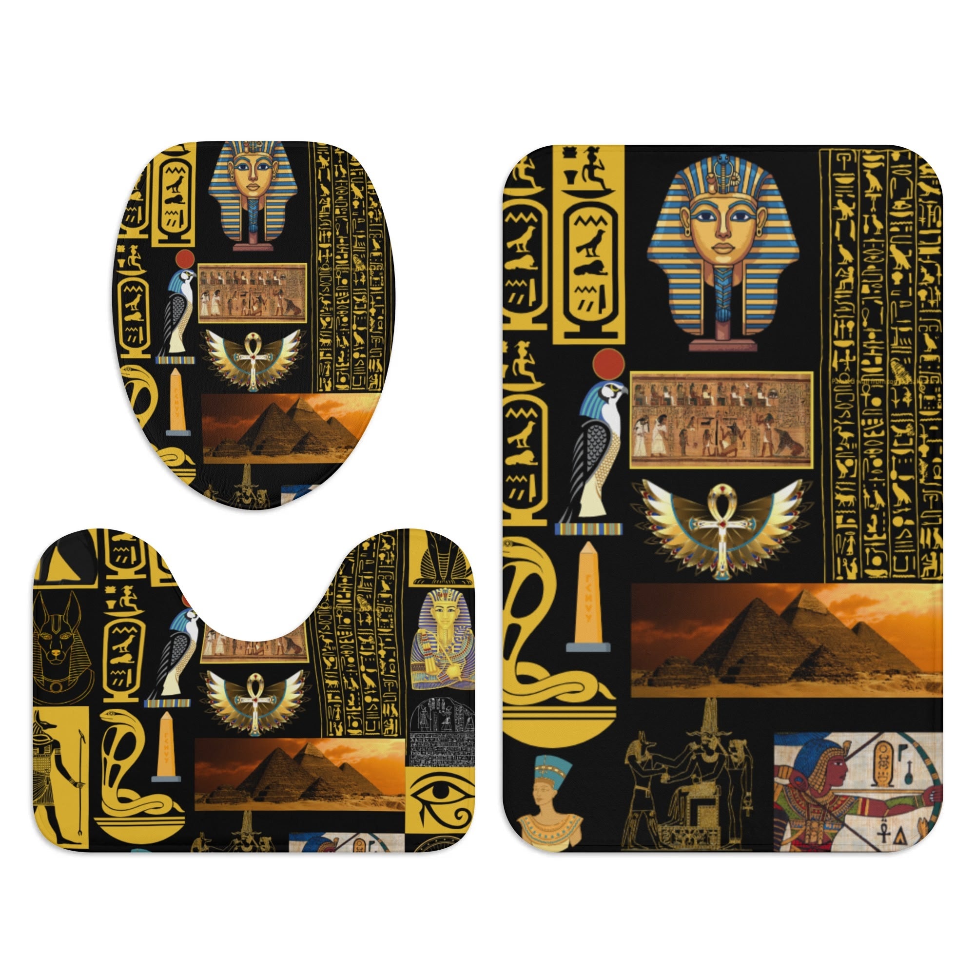 Bring the power, history, and mystique of Ancient Egypt into your home with our stunning 3-Piece Egyptian Bathroom Set. Featuring vibrant gold-and-black artwork inspired by pharaohs, hieroglyphics, sacred symbols, and timeless African heritage, this set instantly elevates your bathroom into a space of cultural pride and royal elegance.