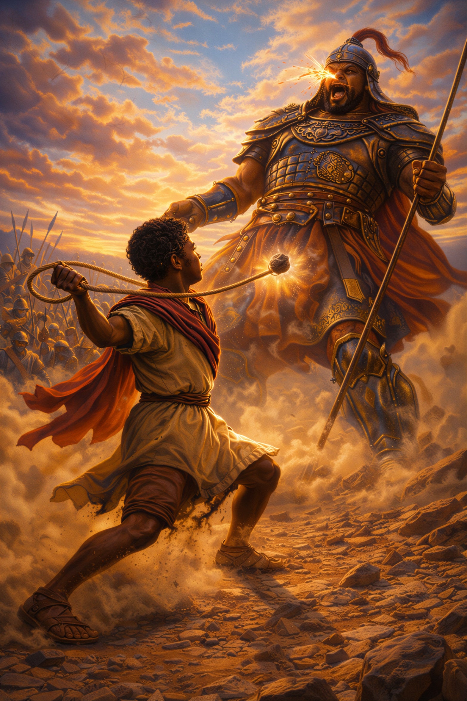 In a dramatic clash between a young shepherd and a towering warrior, David stands firm, guided not by strength alone, but by his faith in God. With a single stone and unshakable belief, he confronts the giant—reminding us that no obstacle is too great when faith leads the way.