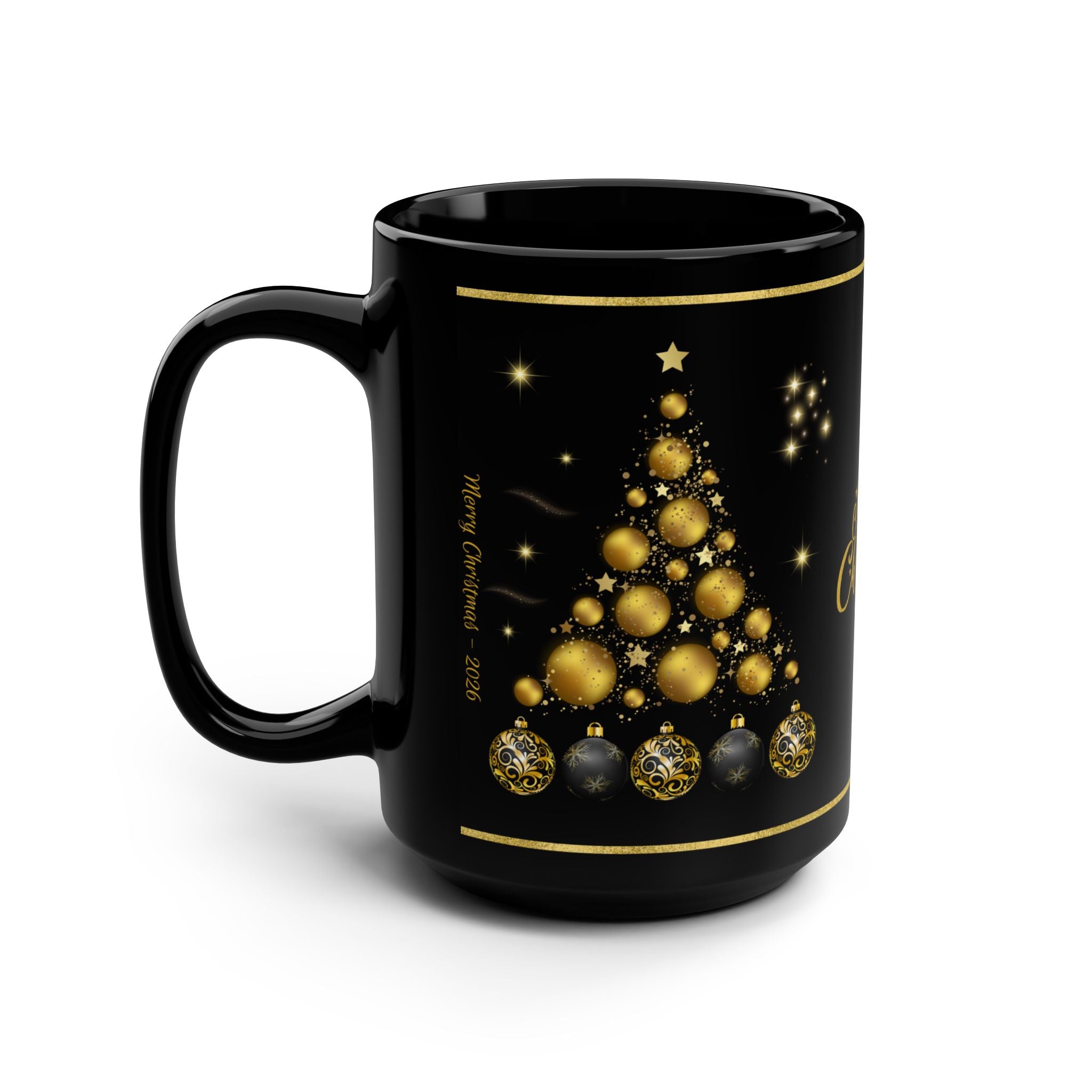 Introducing our Merry Christmas 2026 mug – a stylish and contemporary take on traditional holiday cheer. This elegant mug features a unique Christmas tree, meticulously crafted from an array of black and gold ornaments, complemented by gold stars and a touch of glitter that captures the magic of the season. Perfect for bringing a piece of the festive spirit to the office or creating a memorable holiday table setting, this mug is designed to add a dash of sophistication to your Christmas celebrations.