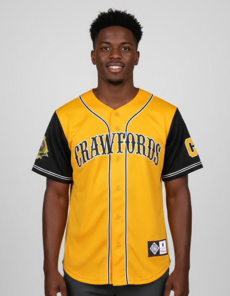 The bold gold body paired with contrasting black sleeves captures the unmistakable Crawfords style, while precision embroidery on both sleeves honors the team’s iconic legacy. Whether you're a sports enthusiast, a history lover, or a collector of Black heritage apparel, this piece brings the spirit of the Negro Leagues to life.