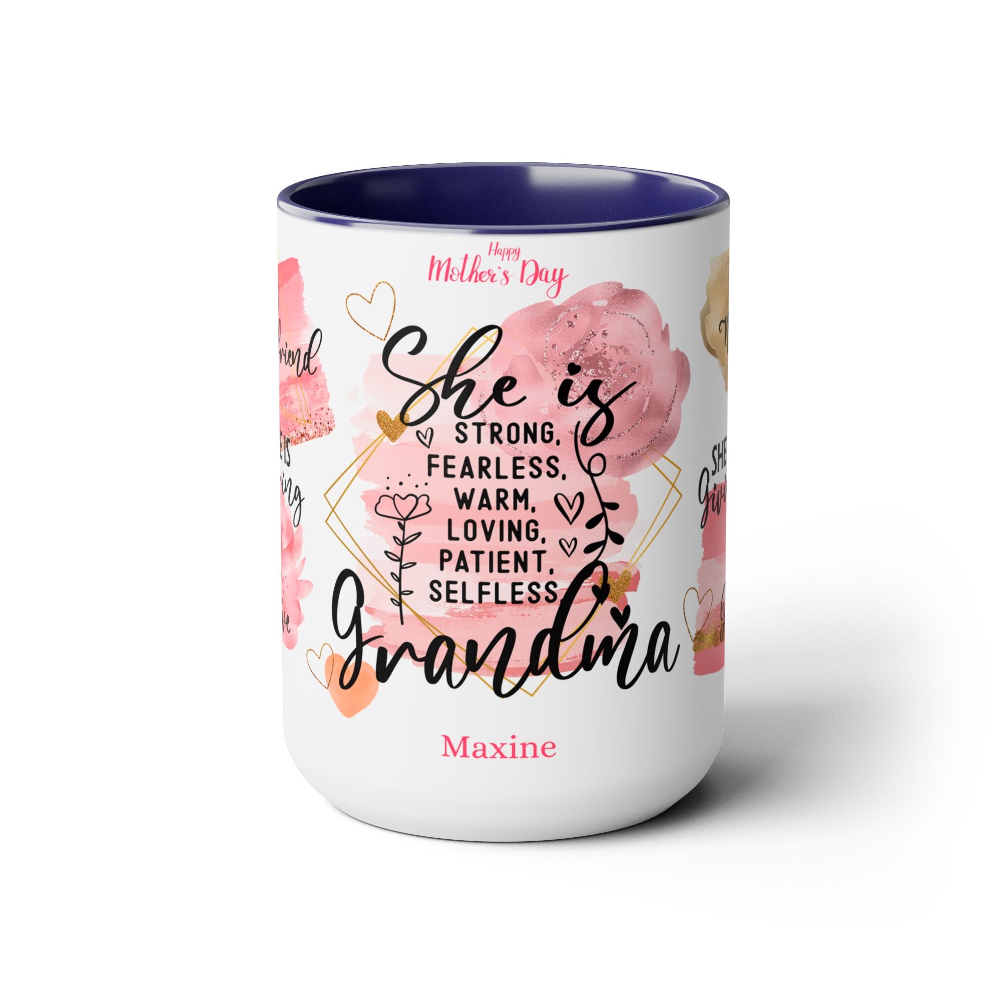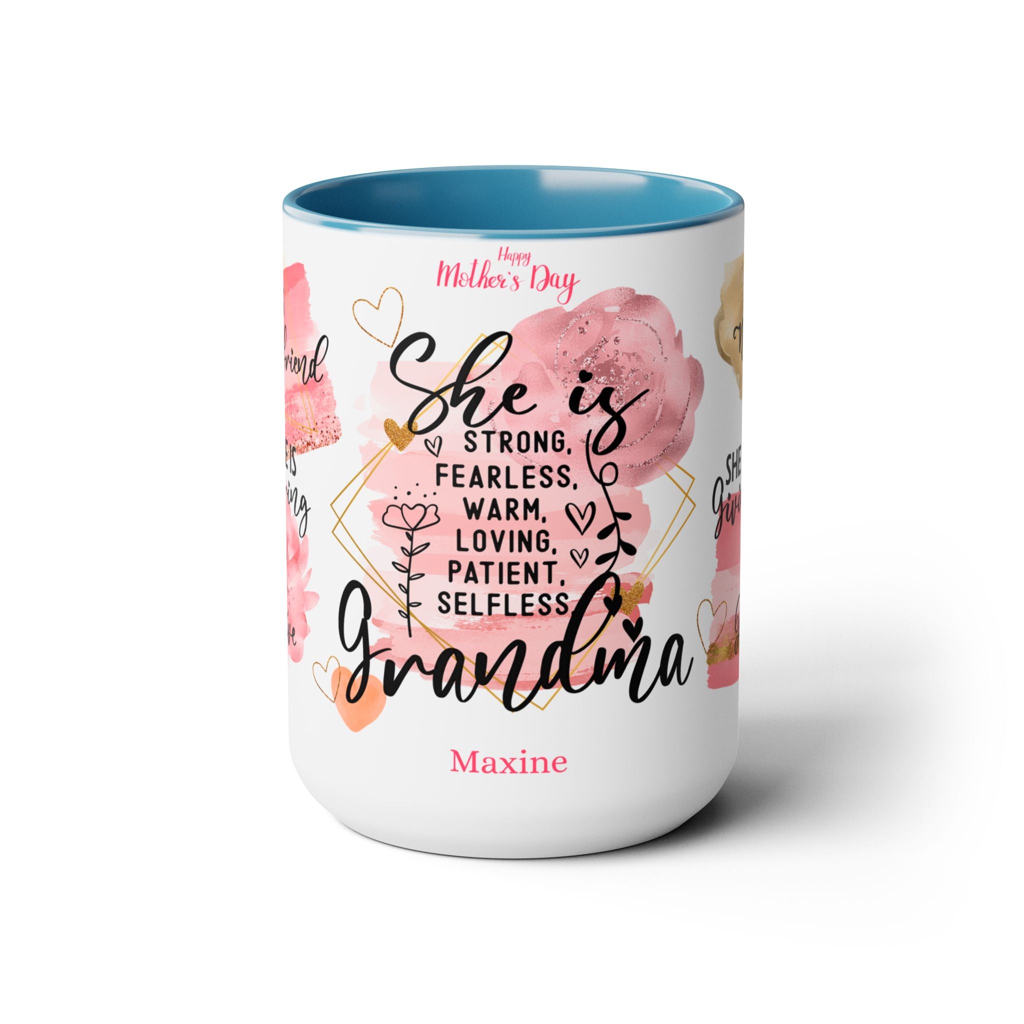 She is Grandma - Personalized Mother's Day Mug. Honor the cornerstone of your family this Mother's Day with our "She is Grandma" personalized mug. Celebrating all the wonderful qualities that make her truly special, this mug features motivational quotes like "She is strong," "fearless," "warm," and "nurturing" in beautiful pastel-colors and cursive fonts, capturing the essence of what makes her amazing.