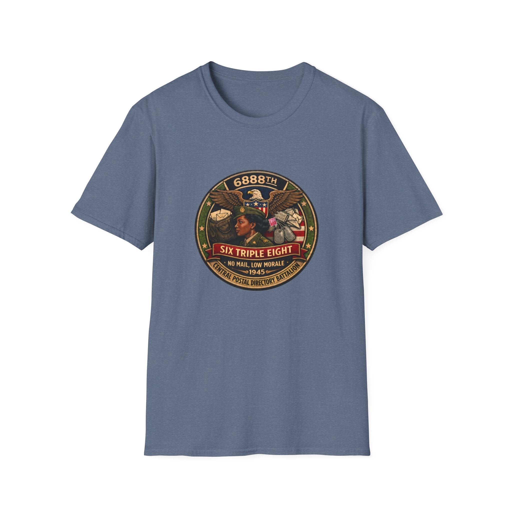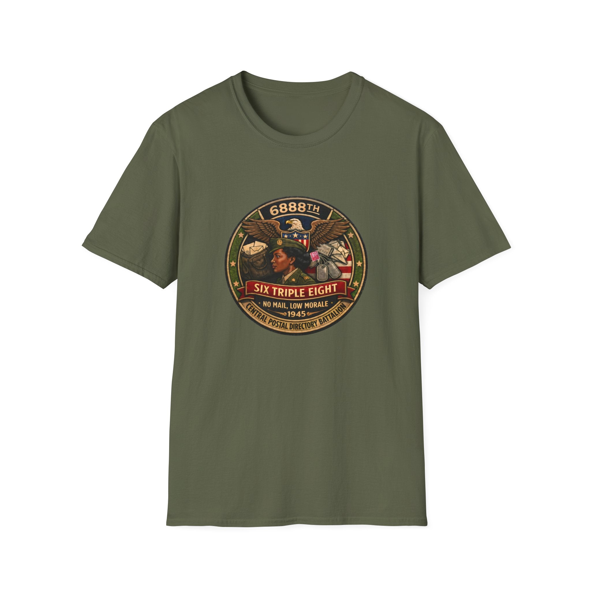 This powerful tee features a vibrant full-color graphic of the Six Triple Eight crest, flanked by symbolic icons that speak to their dedication and sacrifice. Whether you’re wearing it to honor history, make a statement, or spark conversation—this shirt carries meaning with every thread.