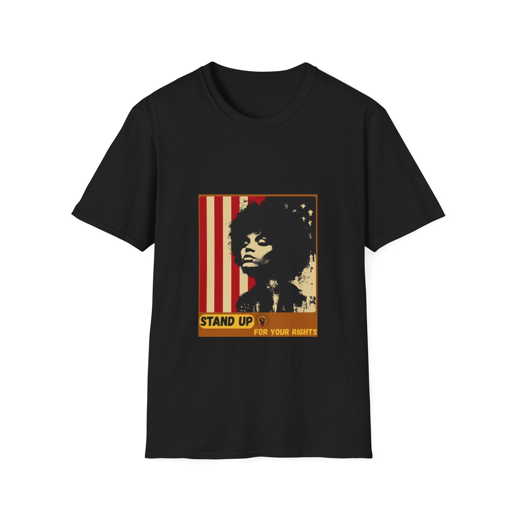 Our Stand Up for Your Rights T-Shirt blends bold street-art style with a powerful message of pride, resilience, and unity. Featuring a striking Afro-silhouette over vintage stripes, this design pays tribute to the courage of generations who stood for justice — and inspires the next ones rising today.