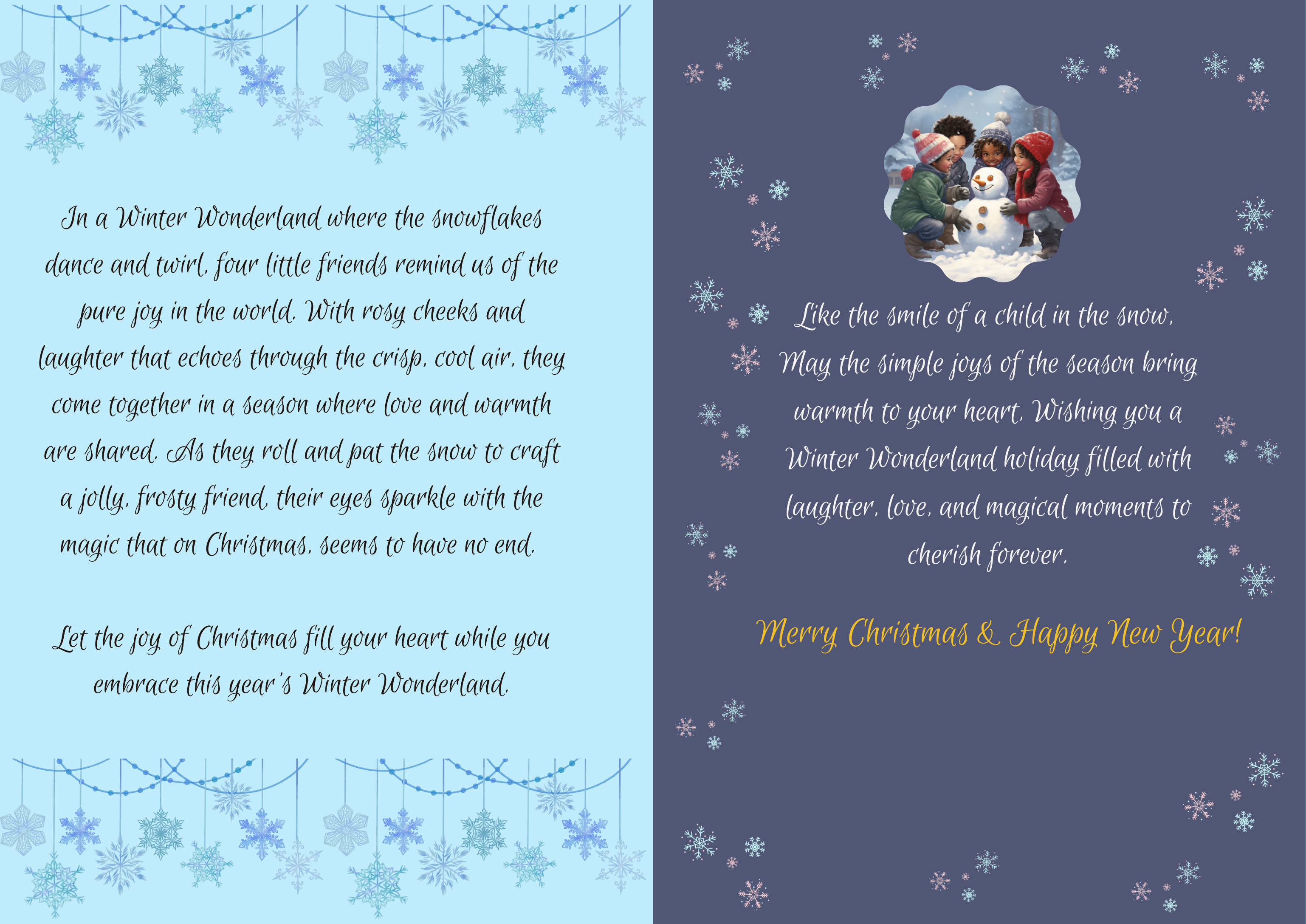 Inside Verse: In a Winter Wonderland where the snowflakes dance and twirl, four little friends remind us of the pure joy in the world. With rosy cheeks and laughter that echoes through the crisp, cool air, they come together in a season where love and warmth are shared. As they roll and pat the snow to craft a jolly, frosty friend, their eyes sparkle with the magic that on Christmas, seems to have no end.